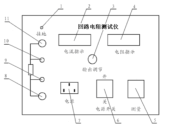 1—接地 2—电流显示(A) 3—电流调节 4—电阻显示(μΩ) 5—测量开关 6—电源开关 7—电源插座 8—电流输出“-”9—测量输入“-” 10—测量输入“+” 11—电流输出“+”