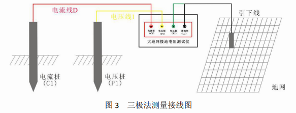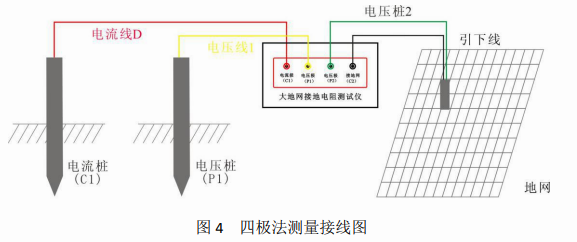 四极法测量时,从地网的地桩上引出二根连接线分别接到仪器的电压极P2、接地网 C2 两接线柱,然后按测量操作步骤进行测试。四极法测量时仪器会自动消除接线误差。